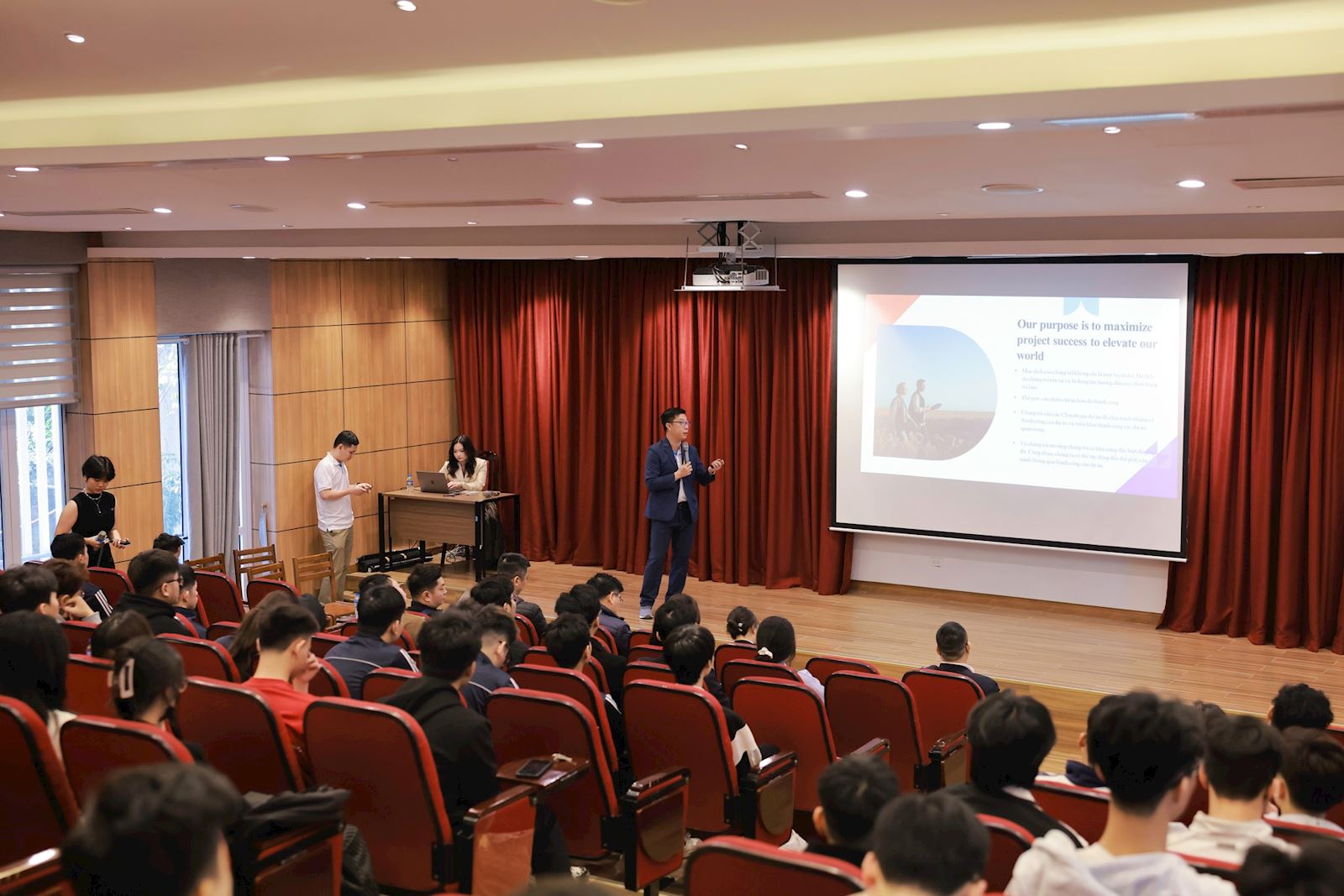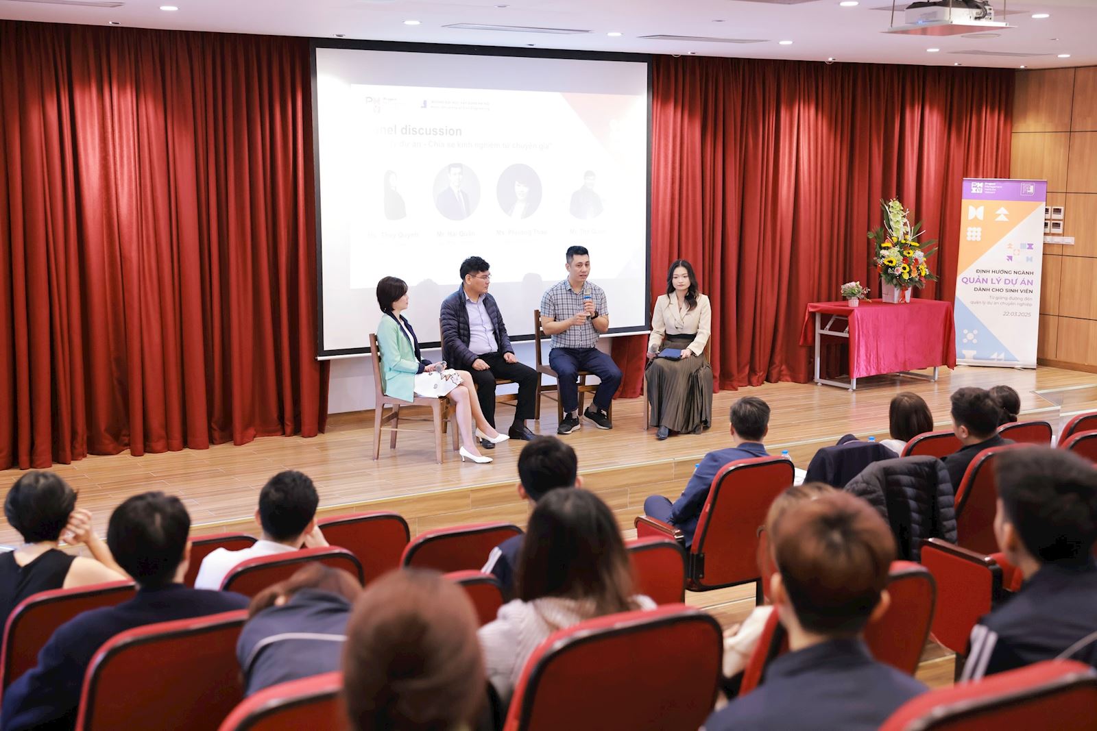 Lecture Hall 13H2 of Hanoi University of Civil Engineering (HUCE) was quickly filled with interested students, especially those from the Project Management Class of the Faculty of Construction Economics & Management. This was an excellent opportunity for students to meet and listen to valuable professional experience sharing from the lineup of guest speakers, who are highly experienced experts in the Project Management Industry.