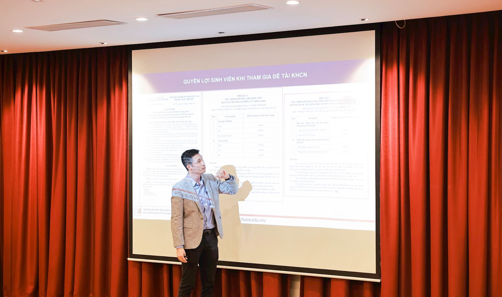 At 6:00 PM on Wednesday, November 27, 2024, the Faculty of Economics and Construction Management, in collaboration with the EEC Economic Engineers Club, successfully organized the talkshow "Students of the Faculty of Economics and Construction Management with Scientific Research". The event, themed "Sharing Experience in Writing Reports, Successfully Completing Student Scientific Research Reports, and Guiding Registration for New Research Projects", was held at Hall 13.H2, Hanoi University of Civil Engineering.