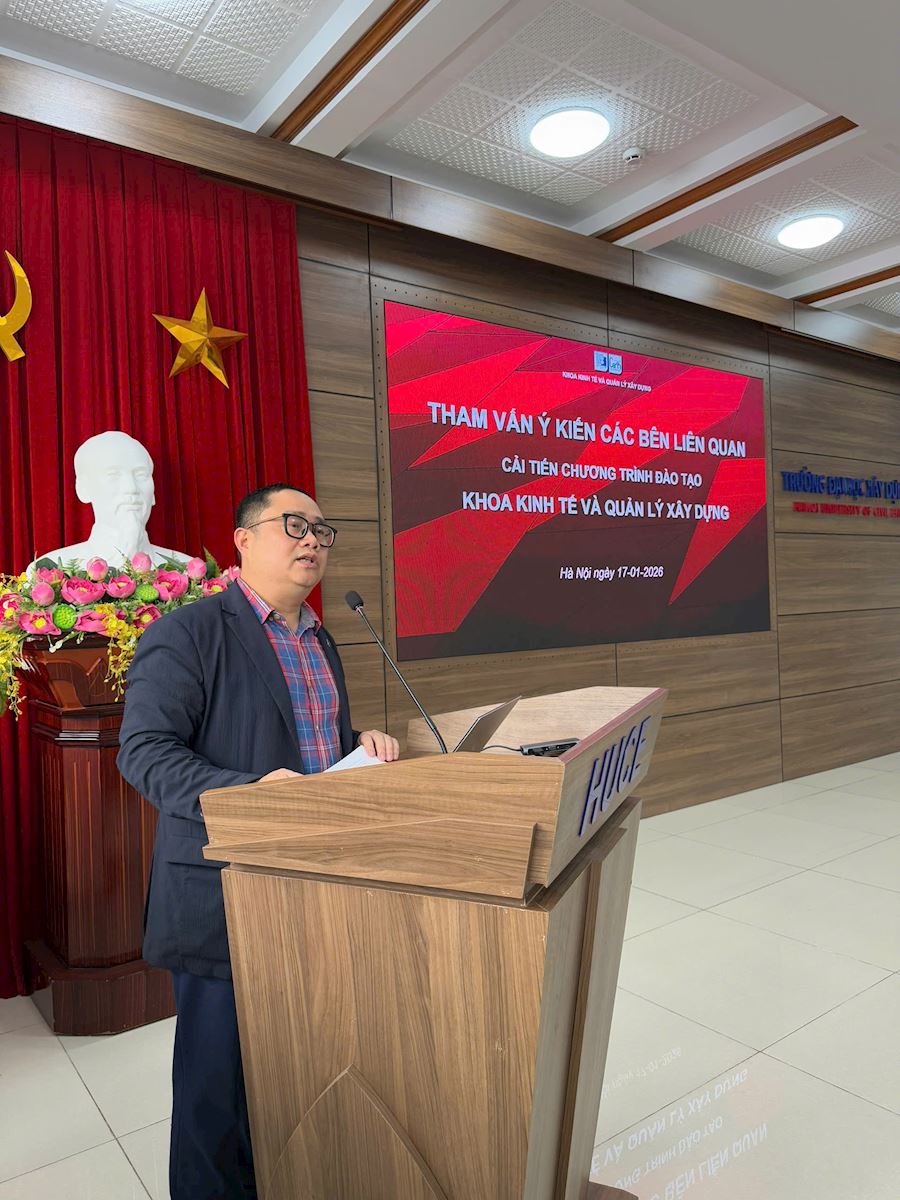 On Saturday afternoon (January 17, 2026), at the Hall on the 2nd Floor of the Library of Hanoi University of Civil Engineering, the Faculty of Construction Economics and Management successfully organized the workshop entitled “Stakeholder Consultation for Improving the Training Program of the Faculty of Construction Economics and Management”. The workshop served as a forum for discussion aimed at enhancing the quality of the training program, thereby meeting the increasingly demanding requirements of the labor market in the fields of construction and real estate.